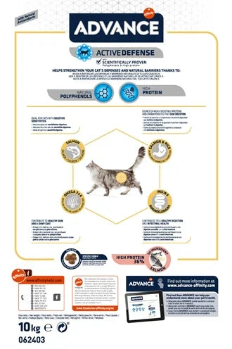 Advance Cat Adult Sensitive Salmon é um alimento seco completo e especialmente formulado para gatos adultos com estômagos sensíveis ou problemas de pele. Este alimento contém salmão como única fonte de proteína, combinado com arroz de fácil digestão. Isto torna-o ideal para gatos sensíveis a outras proteínas animais ou grãos. Graças à adição de ácidos gordos ómega-3 e ómega-6, este alimento contribui para uma pele saudável e um pelo brilhante.