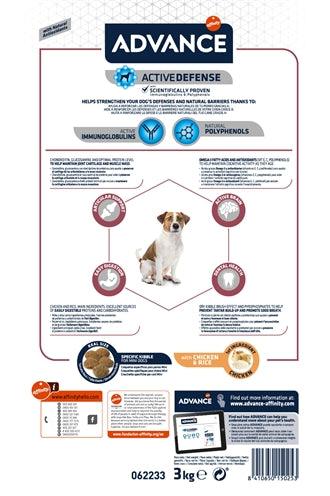 A ração Advance Mini Senior foi especialmente desenvolvida para cães idosos de raças pequenas com 8 anos ou mais. Este alimento completo contém ingredientes de fácil digestão, como frango e arroz, que contribuem para a saúde intestinal. É enriquecida com ácidos gordos ómega-3 para promover uma pelagem brilhante, uma pele saudável e uma função cognitiva. Além disso, os níveis ideais de proteína ajudam a manter a massa muscular, enquanto a glucosamina e o sulfato de condroitina contribuem para a saúde das articulações. O croquete é adaptado ao tamanho da mandíbula dos cães pequenos e ajuda a reduzir a placa bacteriana. Ademais, a ração é enriquecida com taurina para a saúde cardiovascular.