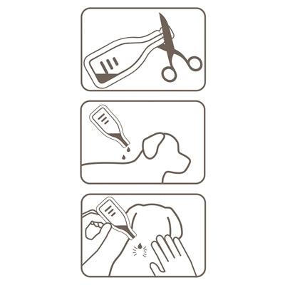 Abra uma pipeta, coloque-a de lado se necessário e, utilizando as duas mãos, solte os pelos do pescoço e aplique todo o conteúdo diretamente sobre a pele. Não esfregue. Não lave até que o produto esteja seco.