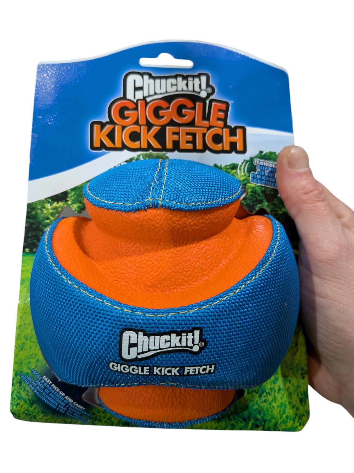 A bola Chuckit Giggle Kick Fetch é única e emite um divertido som de "gargalhada" ao rolar. Isto torna o brinquedo particularmente atraente para cães curiosos e ideal para cães com problemas de visão. O seu formato especial facilita que os cães a apanhem e carreguem. Feita de uma combinação de borracha durável e lona, ​​esta bola foi concebida para proporcionar diversão e brincadeiras de busca duradouras.