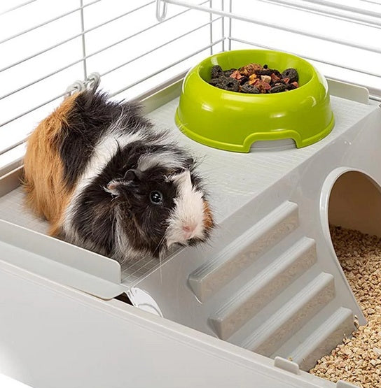 Klatka jest przewidziana dla większych gryzoni (świnki morskie), dlatego pozwala odchylić cały bok - duży otwór daje łatwy dostęp do pupila. Ponadto oddzielana kuweta pozwala również łatwo utrzymać higienę w klatce.