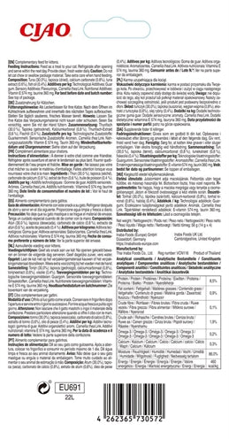Constituintes analíticos: Proteína bruta (mín.) 7%, gordura bruta (mín.) 0,8%, fibra bruta (máx.) 0,3%, humidade (máx.) 88%, DHA (mín.) 0,04%, EPA (mín.) 0,04%, cálcio (mín.) 0,3%, vitamina E (mín.) 310 UI/kg, taurina (mín.) 0,025%