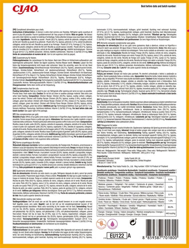 Receita de Frango com Vieiras (5x): Água, frango, amido de tapioca, vieira, aromas naturais, aroma natural de vieira, goma guar, suplemento de vitamina E, taurina, extrato de chá verde.