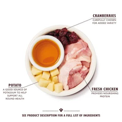 70% frango: frango fresco 65%, fígado de galinha 5%, batata 22%, ovo, molho de frango, linhaça, fruto-oligossacarídeos prebióticos 0,7 g/kg, celulose, queijo italiano, alga, cenoura 0,02%, arandos, mirtilos, salsa 0,02%, sementes de feno-grego