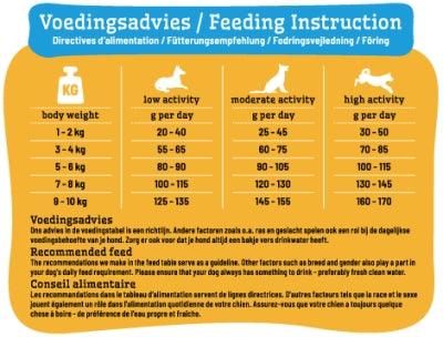 Introduza este alimento gradualmente ao longo de 7 dias para evitar problemas digestivos. Certifique-se de que o seu cão tem sempre acesso a água fresca. Armazene o alimento em local fresco e seco.