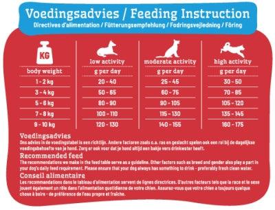 Introduza este alimento gradualmente ao longo de 7 dias para evitar problemas digestivos. Certifique-se de que o seu cão tem sempre acesso a água fresca. Armazene o alimento em local fresco e seco.
