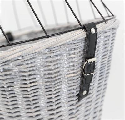 Elegante cesto de bicicleta feito de vime trançado cinza claro.