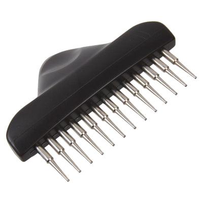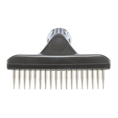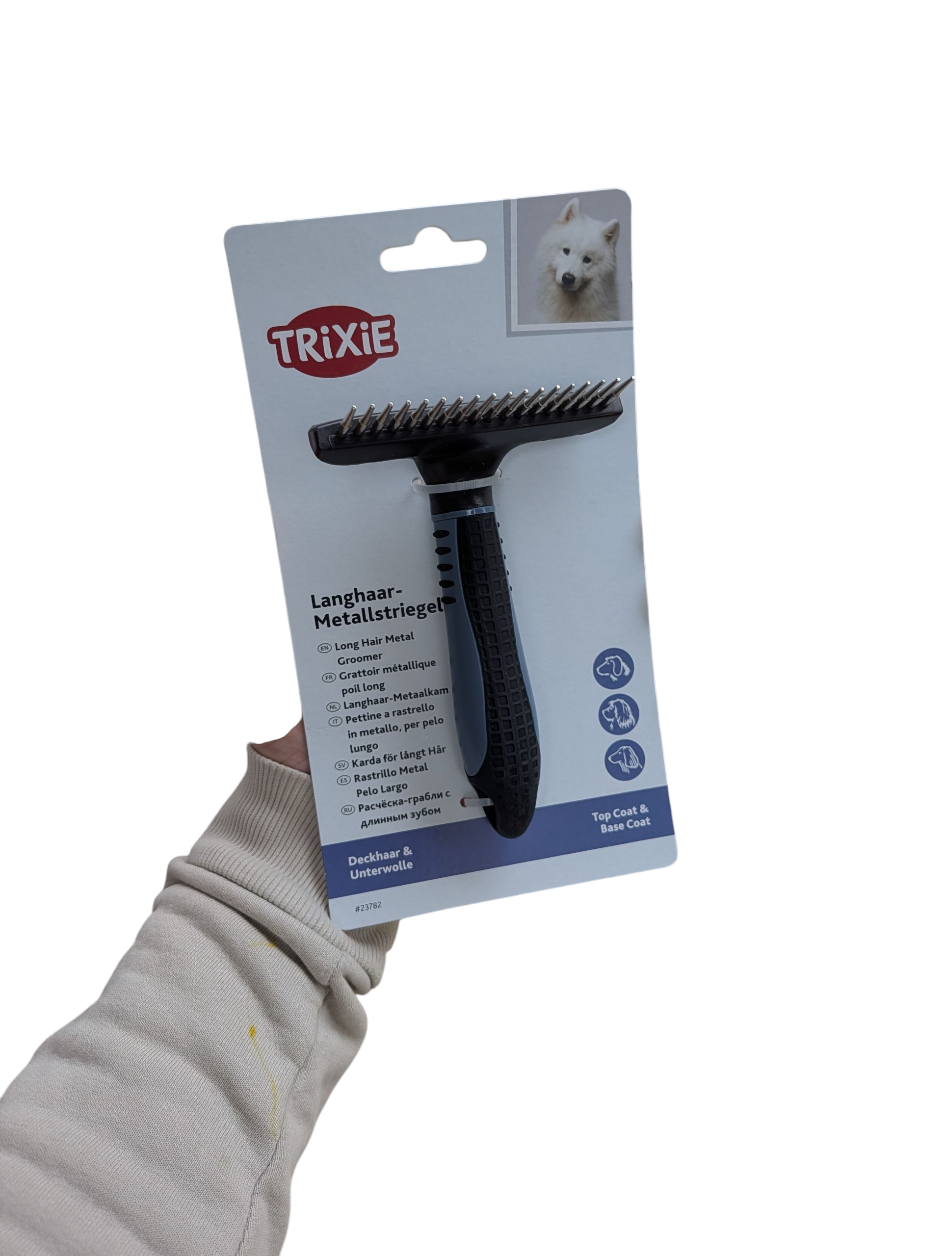 Este pente de metal é adequado para o cuidado intensivo do pelo interior de cães de pelo comprido.