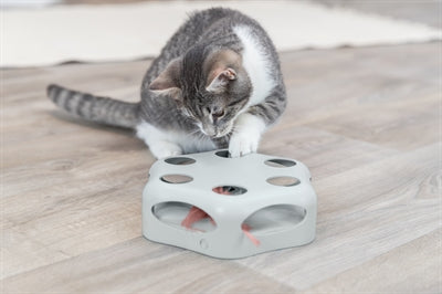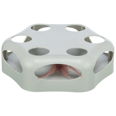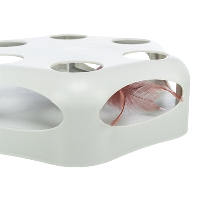 O brinquedo interativo Trixie Turning Feather Assorted é perfeito para gatos curiosos. A pena no centro move-se para a frente e para trás de forma imprevisível, parando ocasionalmente e mudando de direção aleatoriamente — ideal para estimular o instinto de caça do seu gato. O brinquedo pode ser recheado com snacks para aumentar a motivação. Graças aos seus pés de borracha, mantém-se estável durante a brincadeira. Desliga-se automaticamente após cerca de 15 minutos. Necessita de 3 pilhas AA (não incluídas).