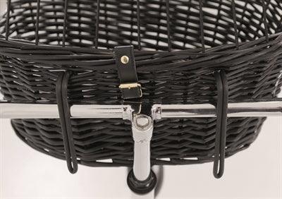Elegante cesto de direção feito de ramos de salgueiro preto entrançados.