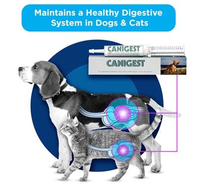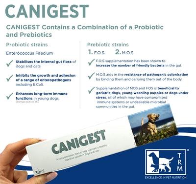 TRM Canigest 30 ml é uma pasta saborosa para cães e gatos que auxilia o sistema digestivo. O poder do Canigest reside na sua fórmula de ação quádrupla, uma poderosa combinação de bactérias benéficas que restaura a flora intestinal. Contém uma combinação de probióticos, prebióticos, glutamina, caulino e pectina, especificamente desenvolvida para auxiliar no tratamento de problemas digestivos nos animais de estimação. A pasta Canigest é fácil de dosear e pode ajudar com: