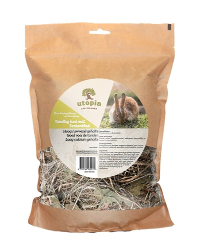 O Feno Timothy com Folha de Bétula Utopia 450g é um suplemento alimentar para coelhos e roedores com alto teor de fibra bruta. O Feno Timothy é um feno saudável e saboroso para coelhos e roedores. Este feno tem um elevado teor de fibra bruta e é benéfico para os dentes e para a digestão. Apresenta também uma relação cálcio/fósforo favorável. O Feno Timothy é um feno muito saboroso e de fácil consumo. A folha de bétula adicionada contém muita fibra bruta e vitamina C. Tem também um efeito positivo na função renal. Este feno é 100% natural, isento de açúcar, intensificadores de sabor, aditivos, corantes e conservantes.
